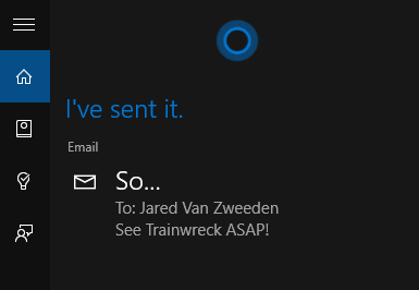 1. Klik pada “Ask me anything” dan katakan dengan keras “I Want to send as email to [[Nama Orang yang telah tersimpan kontaknya]]” dan diikuti dengan isi pesan. Pastikan Cortana sudah aktifkan untuk membaca suara Anda. Bila Anda memri julukan seperti Mom atau Dad Cortana akan meminta Anda untuk memilih sendiri pada kontak.